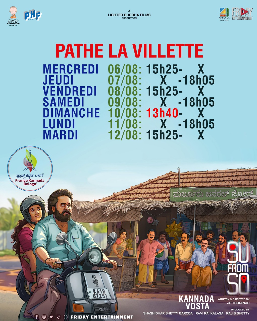 Cette comédie horrifique qui nous vient du cinéma kannada a été un immense succès surprise pour cette industrie régionale. Avec un budget de 6 crores, le film a récolté environ 60 crores de total brut mondial en plus de recevoir un accueil presse brillant. Su From So bénéficie de séances quotidiennes sous-titrées en anglais au Pathé La Villette depuis mercredi. Vous pouvez le voir jusqu'à mardi prochain. Distribué par Friday Entertainment.